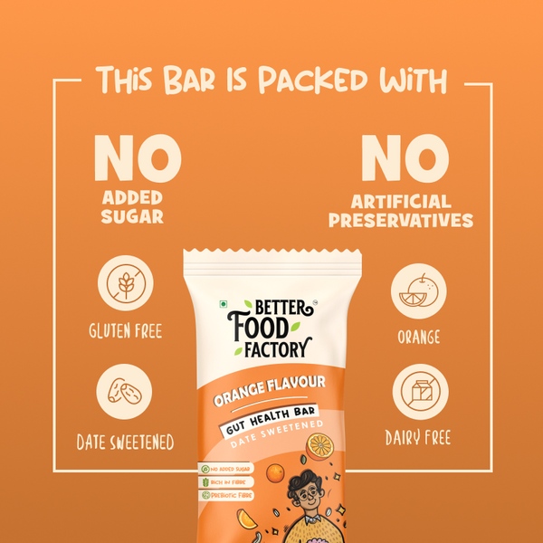 The Gut Health Bar contains natural prebiotics, fiber-rich dry fruits, and gut-friendly ingredients that help maintain a balanced digestive system and promote overall gut health.