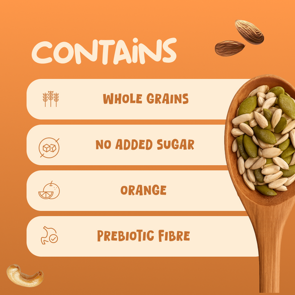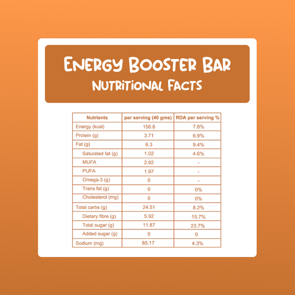 Debug: Raw metafield: Energy (kcal) | 392.0 | 156.8 | 7.8 Protein (g) | 9.28 | 3.71 | 6.9 Fat (g) | 15.75 | 6.3 | 9.4 Saturated fat (g) | 2.55 | 1.02 | 4.6 MUFA | 7.30 | 2.92 | - PUFA | 4.93 | 1.97 | - Omega-3 (g) | 0 | 0 | - Trans fat (g) | 0 | 0 | 0 Cholesterol (mg) | 0 | 0 | 0 Total carbs (g) | 61.28 | 24.51 | 8.2 Dietary fibre (g) | 14.8 | 5.92 | 15.7 Total sugar (g) | 29.68 | 11.87 | 23.7 Added sugar (g) | 0 | 0 | 0 Sodium (mg) | 212.93 | 85.17 | 4.3