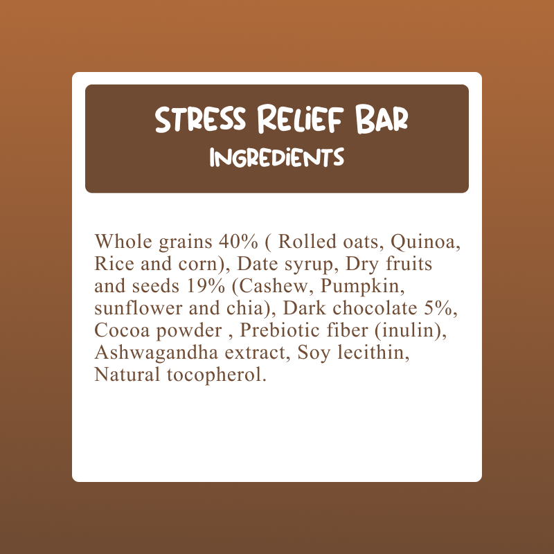 Infused with Ashwagandha, a powerful adaptogen, the Stress Relief Bar helps lower cortisol levels, promotes relaxation, and supports mental well-being.
