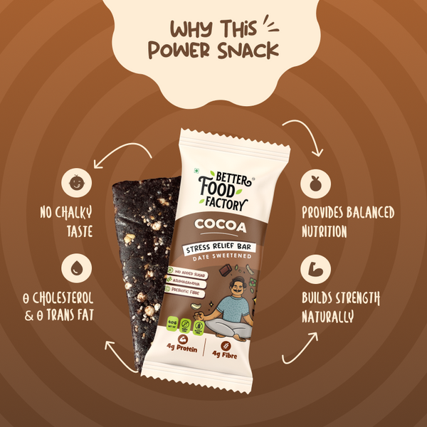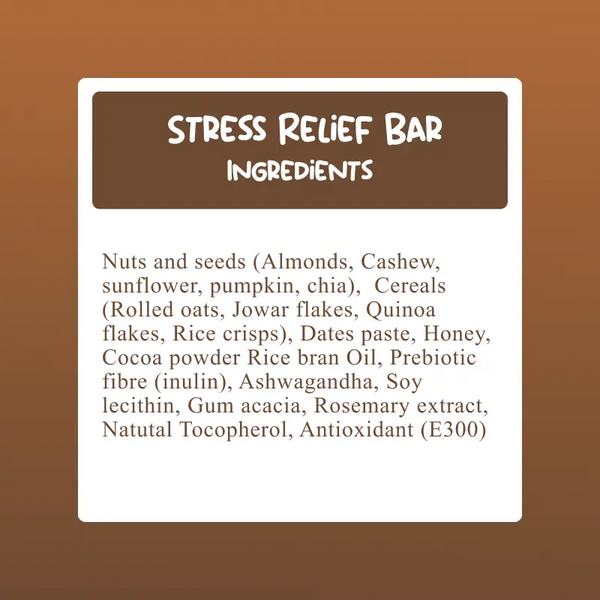 Infused with Ashwagandha, a powerful adaptogen, the Stress Relief Bar helps lower cortisol levels, promotes relaxation, and supports mental well-being.