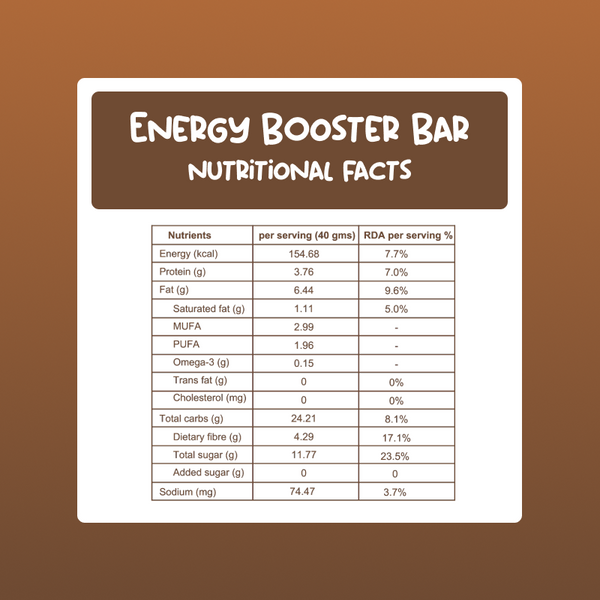 Debug: Raw metafield: Energy (kcal) | 386.7 | 154.68 | 7.7 Protein (g) | 9.4 | 3.76 | 7.0 Fat (g) | 16.1 | 6.44 | 9.6 Saturated fat (g) | 2.78 | 1.11 | 5.0 MUFA | 7.48 | 2.99 | - PUFA | 4.9 | 1.96 | - Omega-3 (g) | 0.38 | 0.15 | - Trans fat (g) | 0 | 0 | 0 Cholesterol (mg) | 0 | 0 | 0 Total carbs (g) | 60.53 | 24.21 | 8.1 Dietary fibre (g) | 10.73 | 4.29 | 17.1 Total sugar (g) | 29.43 | 11.77 | 23.5 Added sugar (g) | 0 | 0 | 0 Sodium (mg) | 186.18 | 74.47 | 3.7