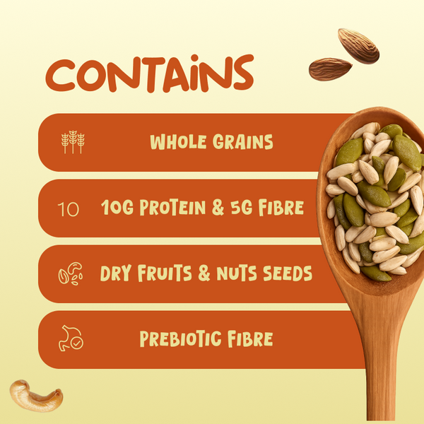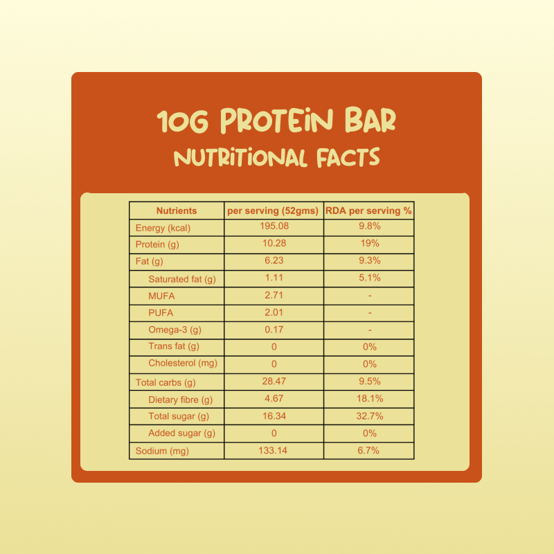Debug: Raw metafield: Energy (kcal) | 375.15 | 195.08 | 9.8 Protein (g) | 19.77 | 10.28 | 19 Fat (g) | 11.98 | 6.23 | 9.3 Saturated fat (g) | 2.13 | 1.11 | 5.1 MUFA | 5.21 | 2.71 | - PUFA | 3.87 | 2.01 | - Omega-3 (g) | 0.33 | 0.17 | - Trans fat (g) | 0 | 0 | 0 Cholesterol (mg) | 0 | 0 | 0 Total carbs (g) | 54.75 | 28.47 | 9.5 Dietary fibre (g) | 8.98 | 4.67 | 18.1 Total sugar (g) | 31.42 | 16.34 | 32.7 Added sugar (g) | 0 | 0 | 0 Sodium (mg) | 256.04 | 133.14 | 6.7